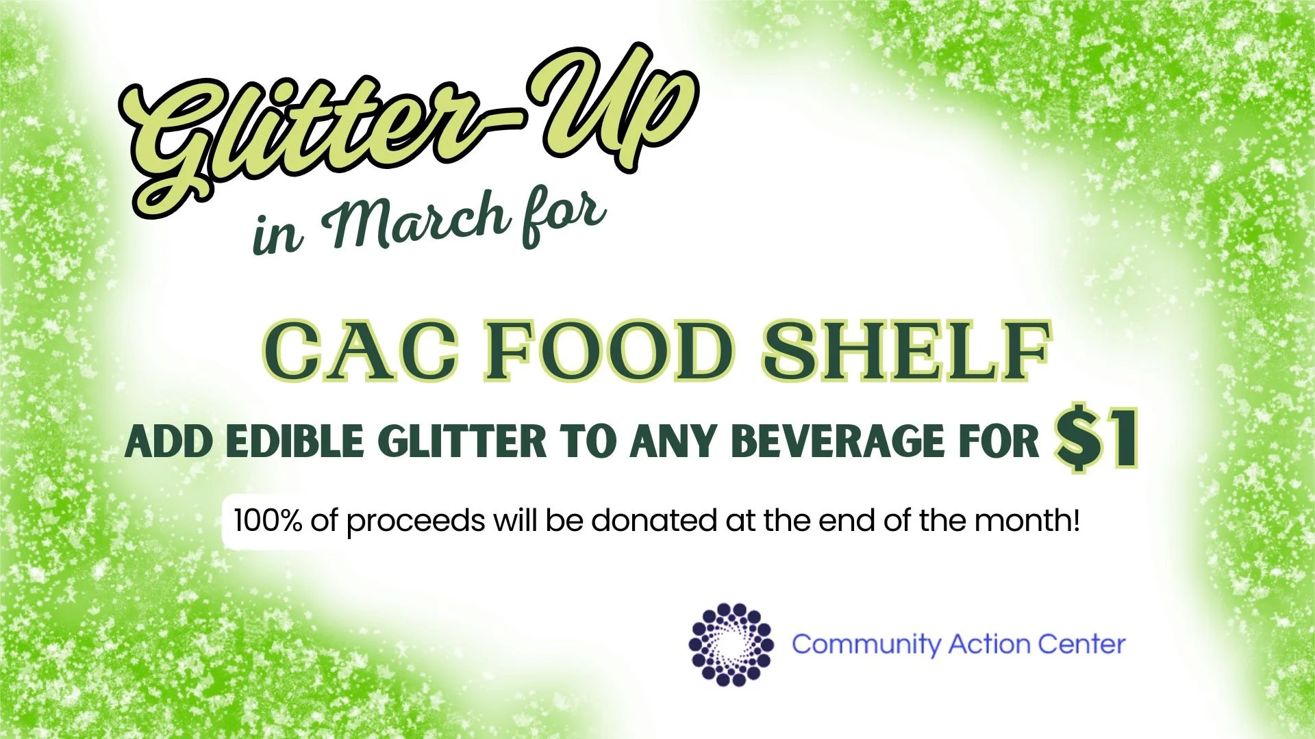 When you order your bevvy, we’ll likely ask if you want to “Glitter up” for an extra $1 (or $2, or however much you want)! As a thank you, we’ll add food-safe glitter into your beverage just for funsies. 100% of these proceeds goes to a rotating local organization that’s doing good work in our community. In March, we’ll donate to the Community Action Center’s Food Shelf. CAC is able to stretch cash donation $10:$1 due to their buying power with food banks. Contributing during MN FoodShare helps CAC stretch every dollar further, making March the most impactful time to give. You can contribute online by clicking the image above, too!