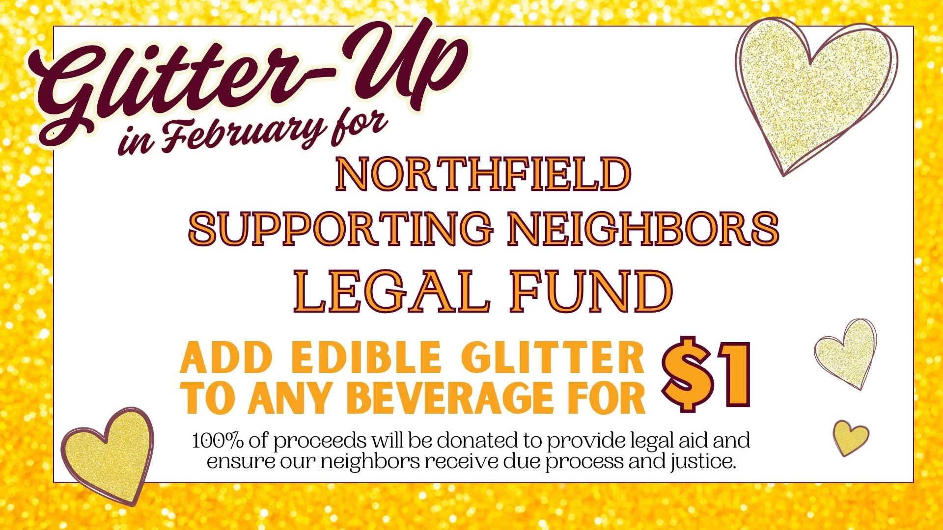 “Glitter up!” for Northfield Supporting Neighbors in February! We’ll ask if you want to add $1 (or more!) to your beverage purchase. 100% of the proceeds goes to the NSN Legal fund - dedicated to helping neighbors access legal aid, especially related to immigration status. As a Thank You, we’ll offer you a little extra pizazz in your bevvy in the form of food safe glitter! —> Click the above photo to donate directly to NSN Legal Fund (their fiscal agent is the CAC - please just click “Other” from the drop-down menu and then type in “NSN Legal Fund.” Thank you so much for your support during this time of extreme need.